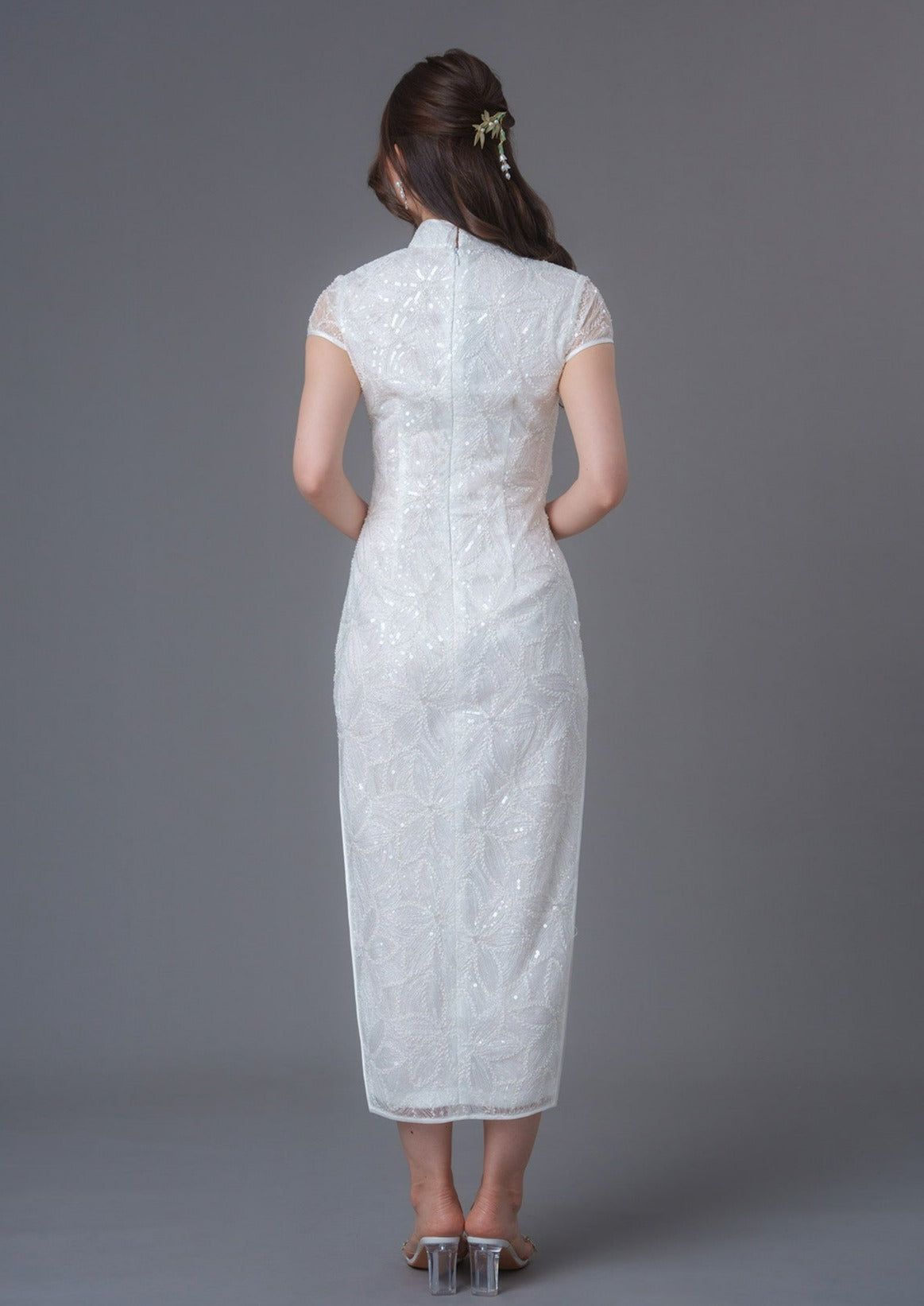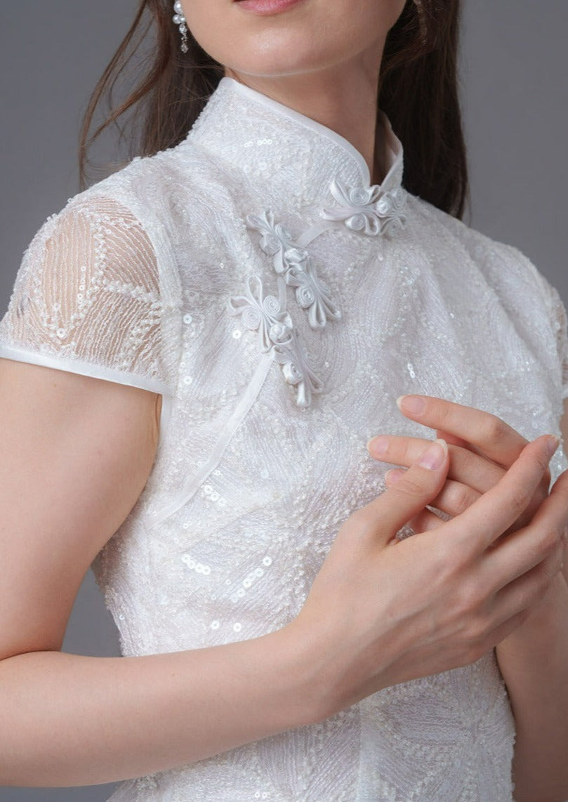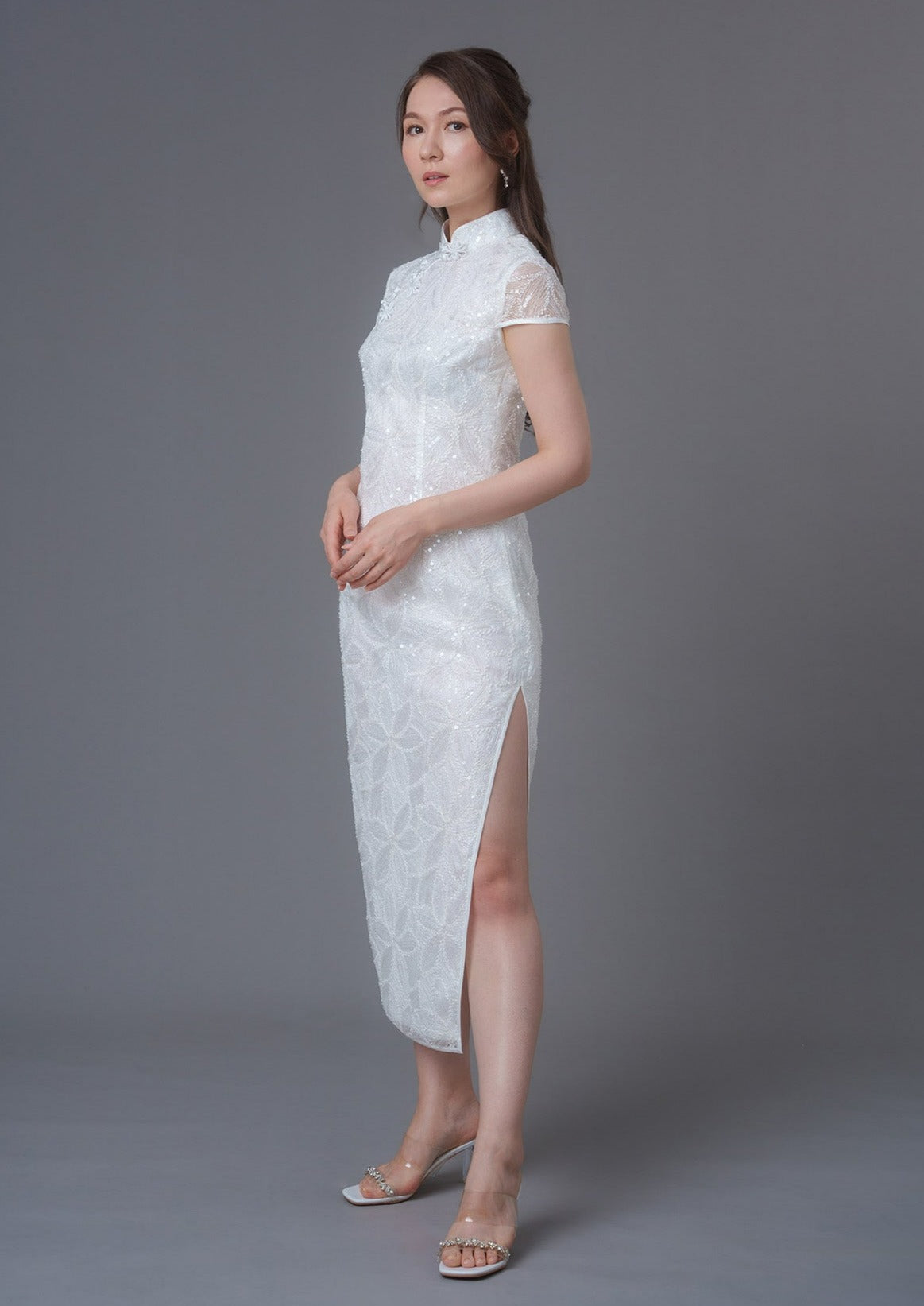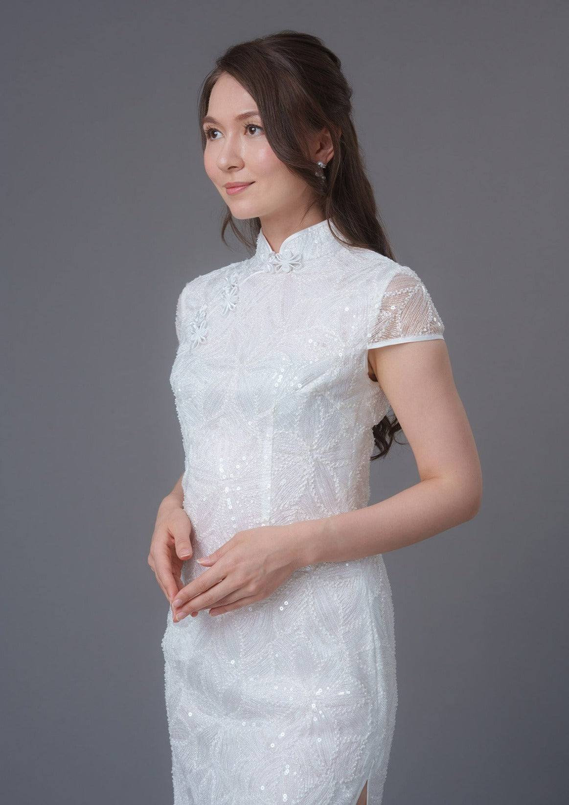 這款Whispering Petals蕾絲旗袍以現代方式演繹傳統旗袍,採用立領設計,搭配盤扣,呈現修身廓形並設有兩側開衩。這款華麗的珠片蕾絲非常適合在證婚儀式或茶會上穿著。搭配金色飾品和高跟鞋,更顯優雅。