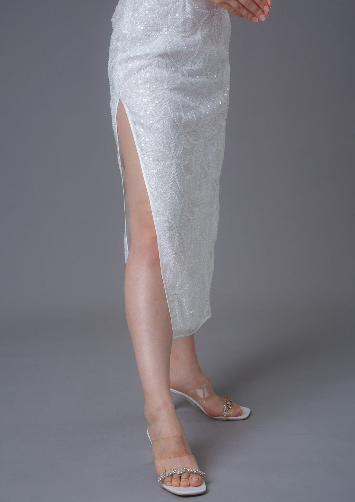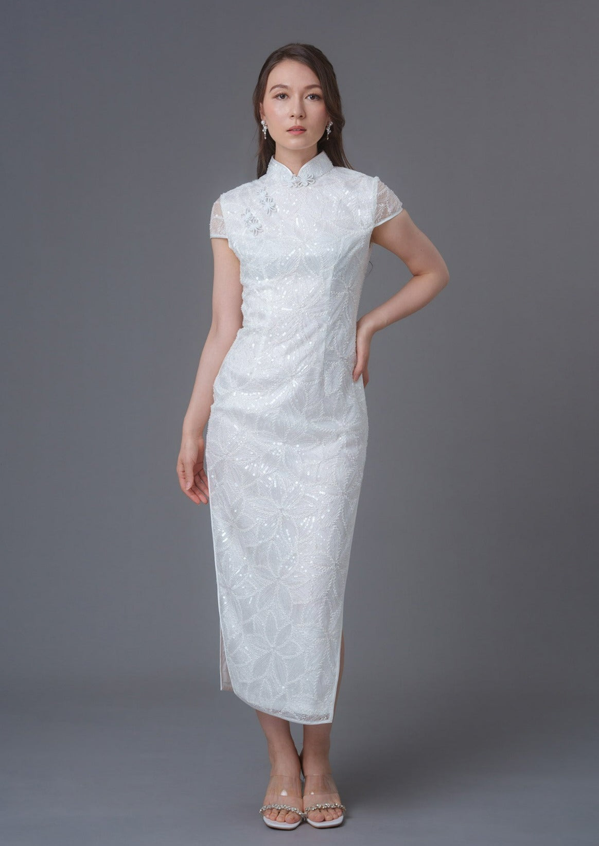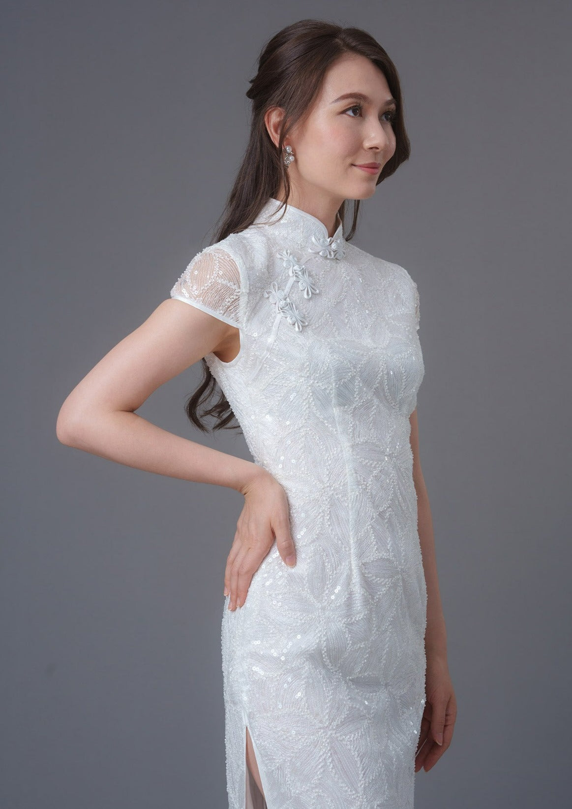 這款Whispering Petals蕾絲旗袍以現代方式演繹傳統旗袍,採用立領設計,搭配盤扣,呈現修身廓形並設有兩側開衩。這款華麗的珠片蕾絲非常適合在證婚儀式或茶會上穿著。搭配金色飾品和高跟鞋,更顯優雅。