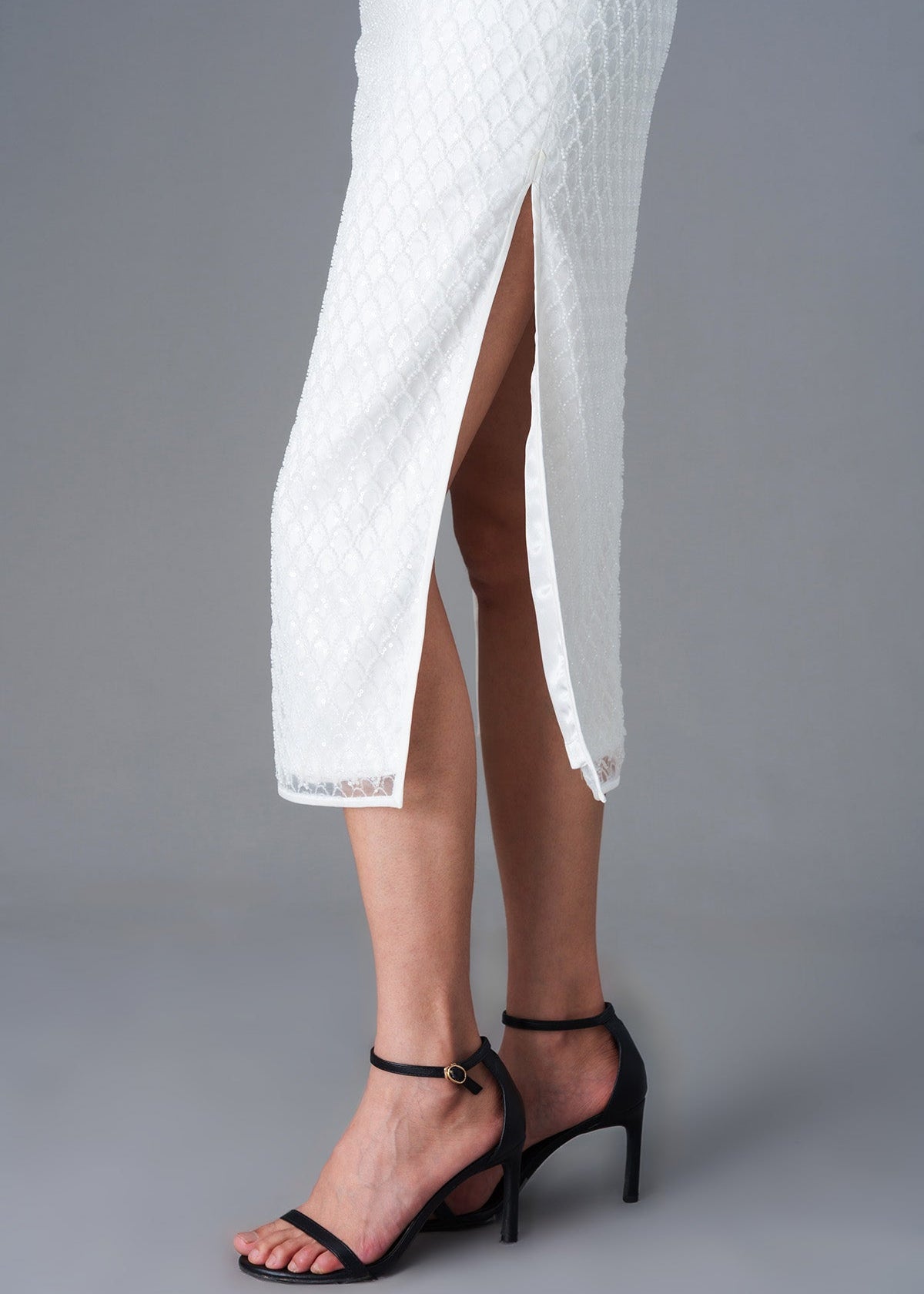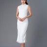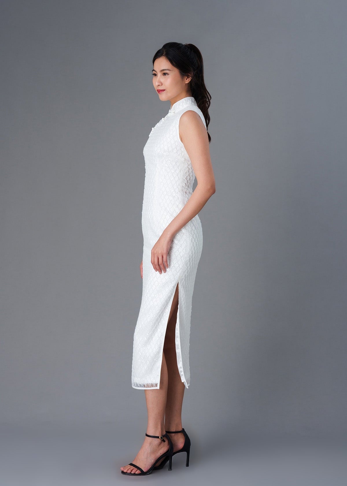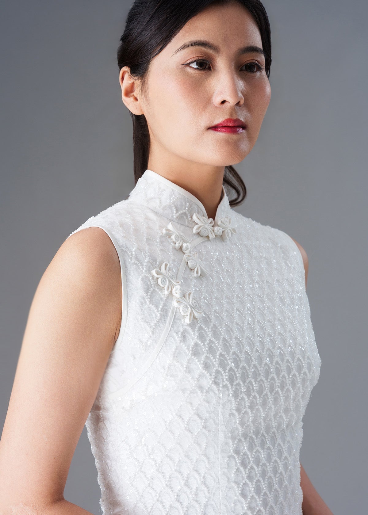 這款典雅之作以精緻盤扣點綴,配以扇貝紋蕾絲細節,將傳統元素與現代風格完美相融,打造出修飾身形的驚豔廓形,尤為適合婚禮或敬茶儀式。